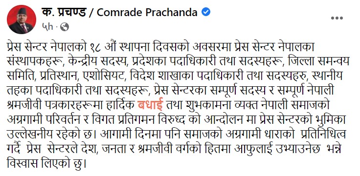 मङ्सिर १५ , काठमाडौँ :-नेकपा (माओवादी केन्द्र) का अध्यक्ष पुष्पकमल दाहाल ‘प्रचण्ड’ले देश र जनताको पक्षमा सही सूचना प्रवाह गर्नका लागि प्रेस सेन्टरको भूमिका महत्वपूर्ण रहेको बताएका छन् । प्रेस सेन्टर नेपालको १८ औँ स्थापना दिवसका अवसरमा आज शुभकामना सन्देश दिँदै अध्यक्ष दाहालले समाजको अग्रगामी धाराको प्रतिनिधित्व गर्दै प्रेस सेन्टरले देश, जनता र श्रमजीवी वर्गको हितमा आफूलाई उभ्याउनेछ भन्ने विश्वास व्यक्त गरेका छन् ।