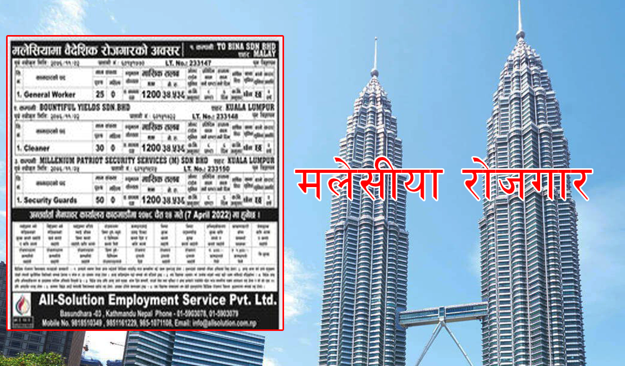 मलेसियाका बिभिन्न कम्पनीहरु बाट नेपालि पुरुष कामदारहरुको माग भएको छ। टु बिना एसडीएन.बिएचडी कम्पनीले २५ जना पुरुष कामदारको माग गरेको हो। न्युनतम मासिक तलब रु.३४५५६ हुने विज्ञापनमा उल्लेख गरेको छ।
