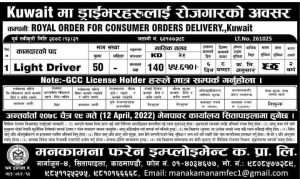 रोयाल अडर फर कन्जुमर अडर डेलिभरी कम्पनी कुवेतले ५० जना लाइट ड्राइभरको माग गरेको छ। उक्त ड्राइभरको तलब मासिक ५५,६१० रुपैया हुने बताईएको छ। तर जिसिसि लाईसेन्स होल्डर हुनु पर्ने छ। मनकामना फरेन इम्प्लोइमेन्ट म्यानपावरले जारि गरेको बिज्ञापनमा उक्त काममा जानेहरुका लागी चैत्र-२९ गते म्यानपावर कम्पनि सीतापाइलामा अन्तर्वाता हुने बताएको छ।