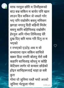 म श्रीमान भएर पनि नभए जस्तो भयो केही कर्तब्य पूरा गर्न सकिन, यो जुनिमा यस्तै भयो अर्को जुनिमा भेटला भन्ने संदेश लेखेर उनले देह त्याग गरेका हुन। आफुले कमाएको पैसा सबै भिडियो तथा विभिन्न अनलाइन, क्यासिनो गेममा हारेको र घर परिवार लाई खर्च दिन नसकेको कारण आत्महत्या गरेको हुन सक्ने संखा गरिएको संगै कार्यरत सहकर्मी साथिहरुले बताए।