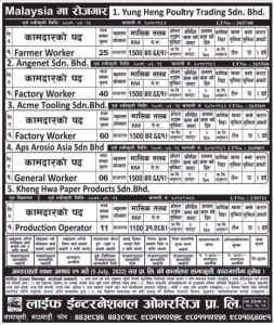 क्वालालम्पुर- मलेसियाका ५ विभिन्न कम्पनिहरुले १४२ जना पुरुष कामदारको माग गरेको छ। उक्त कम्पनिहरुले नेपाली कामदारहरुको माग गरेको हो। न्युनतम तलब मलेसिया सरकारले तोकेको आर.एम-१५०० हुने जनाएको छ। भने यो मागपत्र लाइफ इन्टरनेसनल सर्भिसेज प्रा.लि सामाखुसी काठमाडौ अन्तर्गत आएको हो। सो कम्पनिमा कामदारको रुपमा जान इच्छुकहरुले असार-२१ गते अन्तर्वार्ता दिनुपर्ने म्यानपावर कम्पनिले सार्बजनिक गरेको बिज्ञापनमा जनाएको छ।