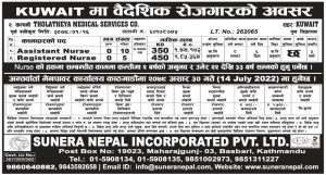 कुवेतमा नेपाली नर्सहरुलाई रोजगारीको सुवर्ण अवसर रहेको छ। असिस्टेन्ट नर्स र रजिस्टर नर्स गरी २ विभागमा कामदार लैजान लागेको हो। म्यानपावरले जारी गरेको बिज्ञापन अनुसार उक्त नरसिंग कामका लागी जानेहरुले सो क्षेत्रमा कम्तिमा २ बर्ष काम गरेको अनुभब हुनुपर्ने जनाएको छ। खान बस्ने सुबिधा सहित ३५० केडी र ४५० केडी तलब हुने विज्ञापनमा उल्लेख गरेको छ।