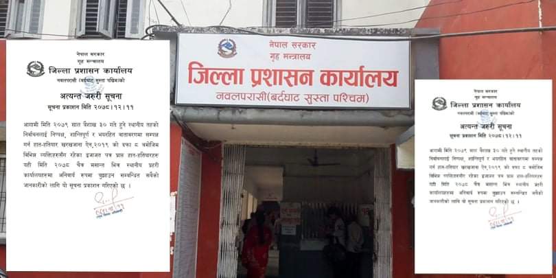 चैत मसान्तसम्म हतियार बुझाउन जिल्ला प्रशासन कार्यालय पश्चिम नवलपरासीको आग्रह